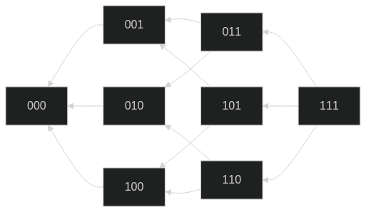より形式的には,頂点 ii からは,頂点 i&20~,i&21~,i&22~,,i&2d~i \,\&\, \tilde{2^0},\, i \,\&\, \tilde{2^1},\, i \,\&\, \tilde{2^2},\, \dots,\, i \,\&\, \tilde{2^d} (ただし自分以外) の O(d)O(d) 個の頂点へ辺が張られます.